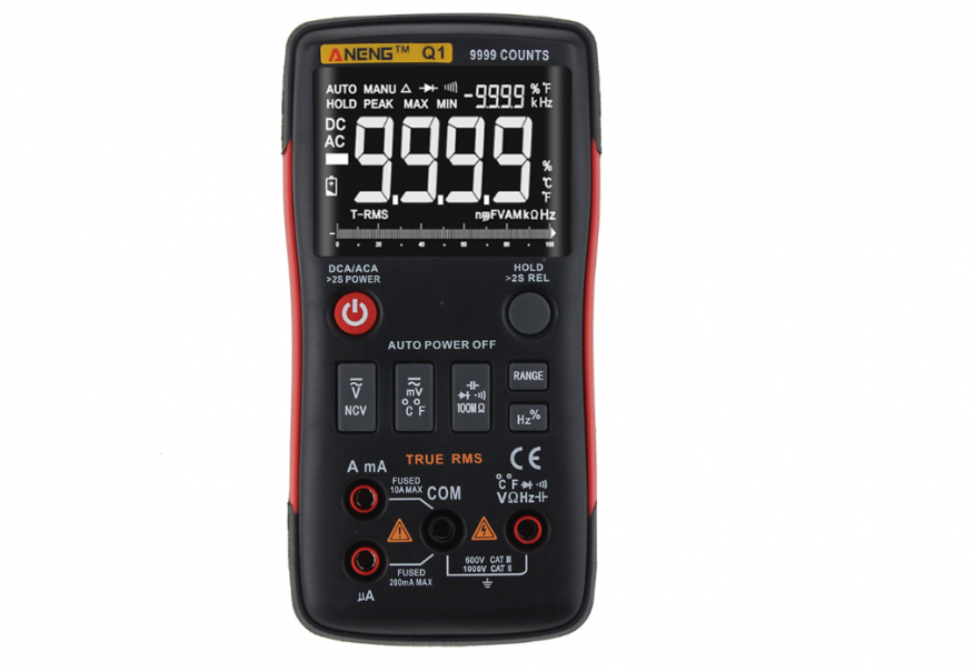 Еще одна крайне популярная и качественная модель Q1 от ANENG. Имеет быстрый чип на 9999 отсчетов, удобный карманный корпус, В отличие от предыдущего имеет округлые формы (не цепляеся в кармане) и питается от 2 х ААА батарей. Из функций: аналоговая шкала, TrueRMS, неконтактный датчик напряжения (NCV), инверсный экран, температура, частота, скважность. Мультиметр полный автомат — умеет определять нужный диапазон измерения. Кстати, в этой модели избавились от селектора режимов, что положительно сказывается на дологовечность эксплуатации.