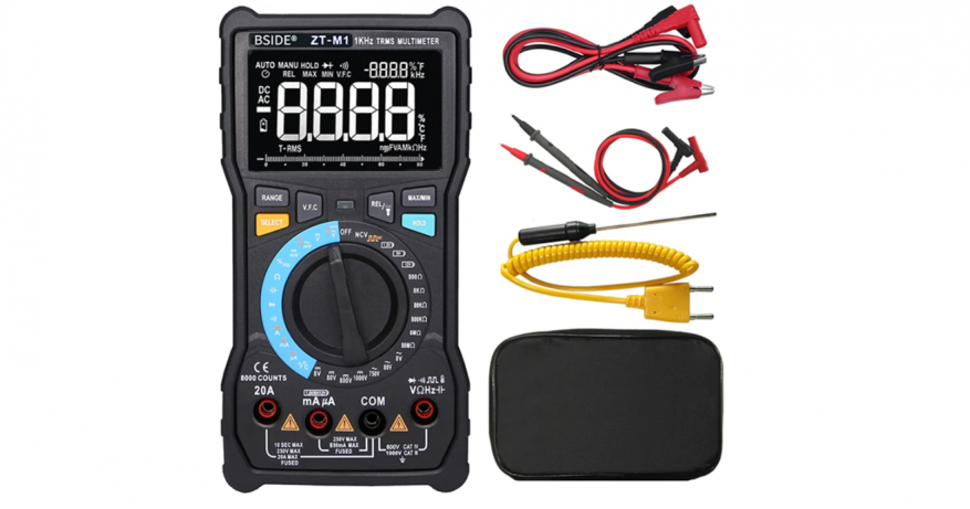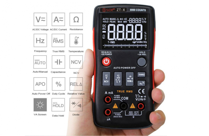 Еще раз популярная модель мультиметра в компактном корпусе. Это BSIDE ZT-X, он же Richmeters RM409B и ZOYI ZT-Х, и ANENG Q1, про который шла речь выше. Все эти братья близнецы отличаются друг от друга ценой — за бОльшую стоимость производители комплектуют мультиметр дополнительными щупами и сумочкой (или наоборот). В любом случае, это в принципе один из лучших мультиметров на рынке — 9999 отсчетов, быстрая прозвонка, все необходимые функции, TrueRMS, аналоговая шкала, частота и скважность сигнала и так далее.