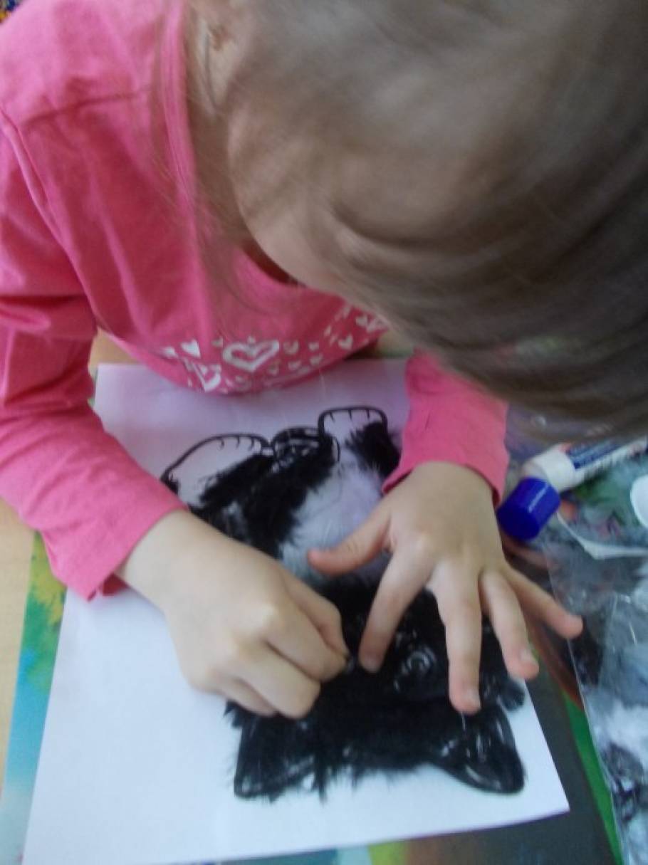 Трафарет котенка смазываем клеем, и начинаем приклеивать перышки сверху- вниз.