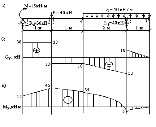 По вычисленным значениям строим эпюры Qy и Mx (рис.9,б,в).