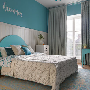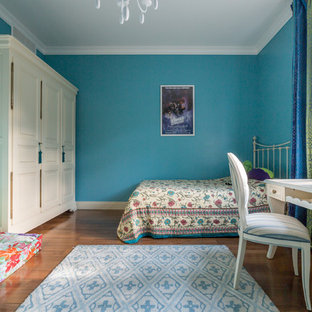 Новый формат декора квартиры: детская в классическом стиле с синими стенами и паркетным полом среднего тона для подростка, девочки