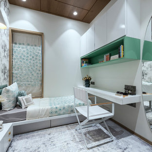 Свежая идея для дизайна: детская в современном стиле с спальным местом, белыми стенами, ковровым покрытием и серым полом для девочки – отличное фото интерьера