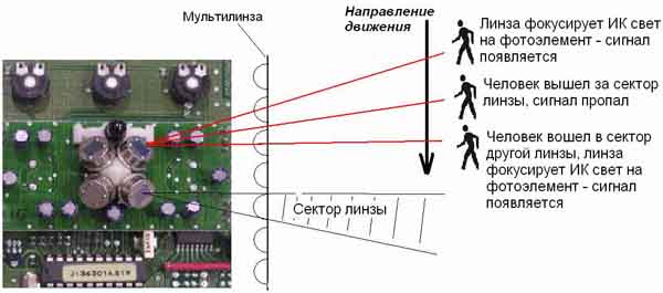 При движении человека через какое-то время фокус линзы уходит с фотоэлемента и сигнал пропадает. Затем уже другая линза фокусирует ИК свет человека на фотоэлемент – сигнал опять появляется. Такое появление-исчезновение-появление сигнала – признак присутствия человека. Каждая линза охватывает свой сегмент. Сигнал пропадает при выходе человека (руки человека) за границы этого сегмента. При перемещении внутри сегмента, сигнал не меняется.
