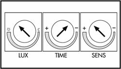 Дождитесь освещенности от окон, при которой датчик должен включать светильники. Медленно поворачивайтее потенциометр Lux, пока не включится свет. Если потенциометры на тыльной стороне датчика, то придется его снимать, поворачивать потенциометр, устанавливать датчик и проверять включение светильников. Не включились, опять повторяйте эту процедуру.