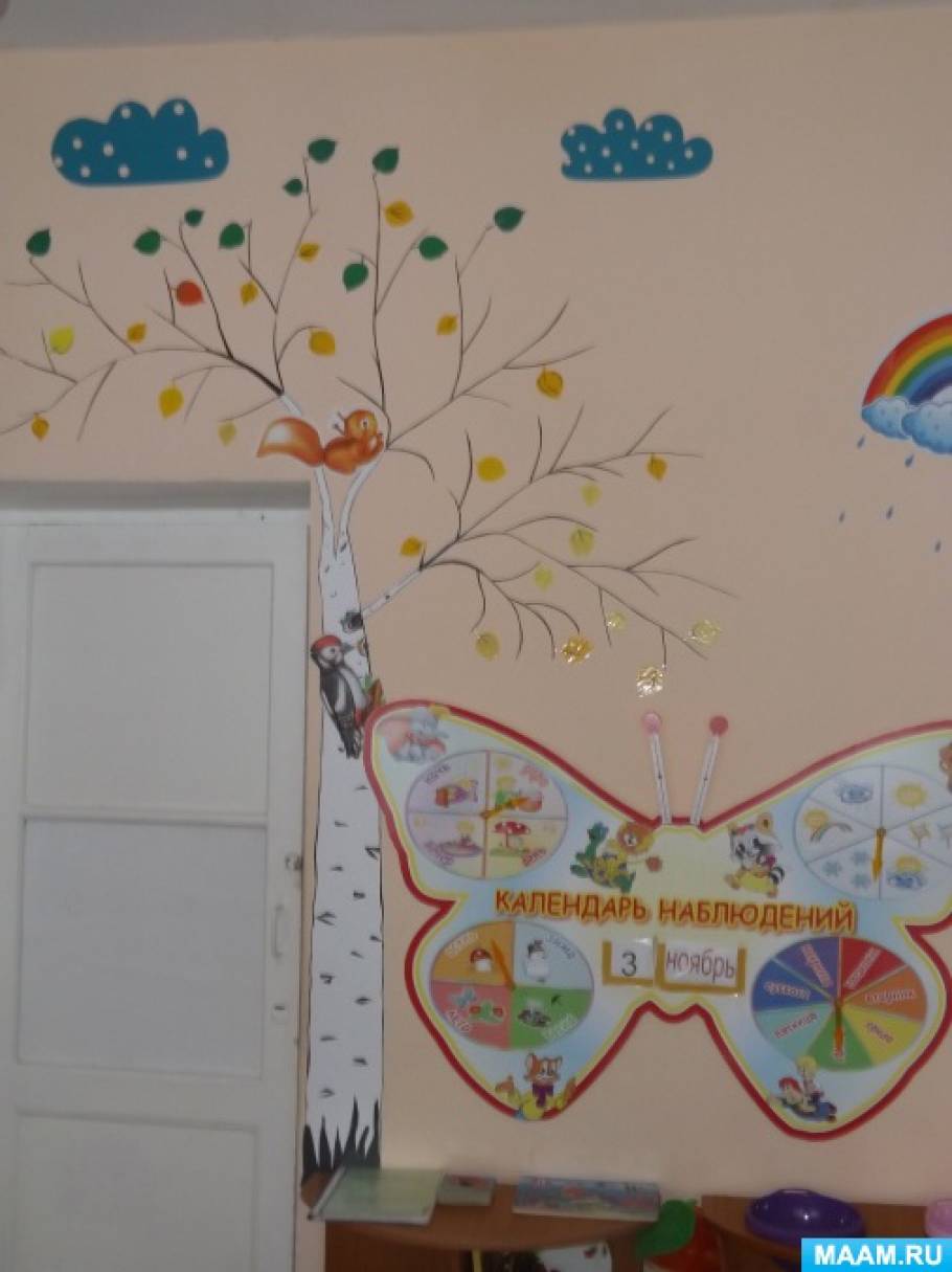 Особое внимание в группе уделяем экологическому воспитанию. При оформлении исследовательского центра природы стояла задача сделать больше наглядности для детей, поэтому на стене было изображено дерево (береза). В соответствии с каждым сезоном украшаем наше дерево : зимой – это снежинки, весной – зелёные листья, а осенью – яркие осенние листочки. Так дети всегда помнят главные признаки времён года, а в группе стало красивее.