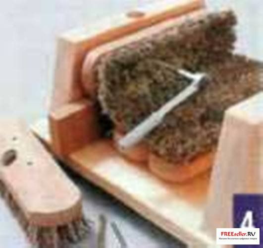 Для изготовления данной конструкции вы можете приобрести набор таких щеток, какие кажутся вам наиболее подходящими для вашей семейной обуви. Если такая четырежды щетка будет стоять на открытом воздухе, для ее изготовления больше подойдут щетки с пластиковой основой – из-за возможного дождя и сырости. Конструкция из щеток с деревянной основой вполне годится для веранды. Кроме того, мы советуем вам просто приобрести швабру и сменный набор щеток к ней. Древесина – материал податливый, он не потребует от вас ни узкопрофессиональных знаний, ни каких-либо специальных инструментов. Если вы взяли щетки, тыльная сторона которых несколько выпукла, то нужно эту выпуклость снять рубанком, чтобы щетки могли плотно прилегать друг к другу. Для прочного крепления основ щеток к деревянному или фанерному каркасу конструкции вам придется просверлить каждую щетку насквозь. Сверлить следует только с той стороны, где располагается щетина. Если вы будете сверлить отверстие с тыльной стороны, то сверло обязательно натолкнется на щетинки. Лишившись своего крепления, щетинки выпадут, и на щетке образуются залысины.