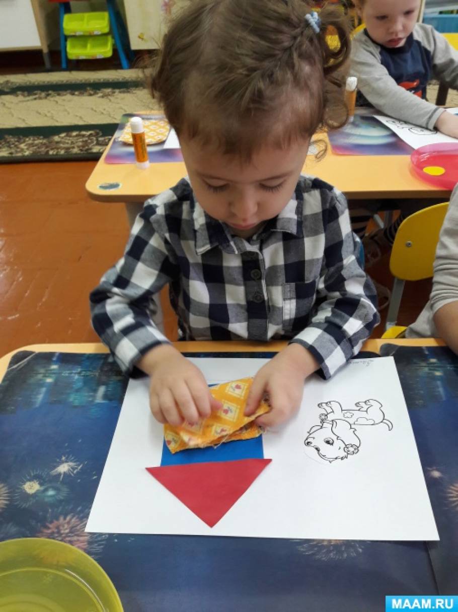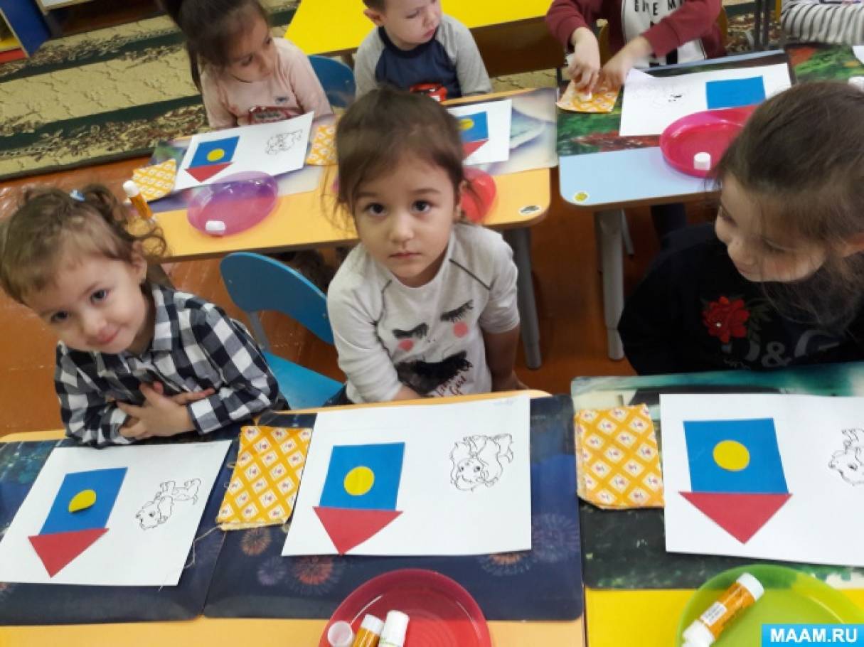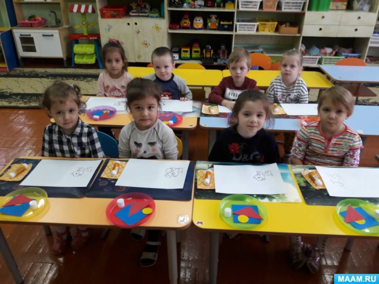 Материал: лист бумаги с наклеенными собачками, готовые геометрические фигуры для наклеивания, клей карандаш, цветные карандаши.