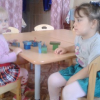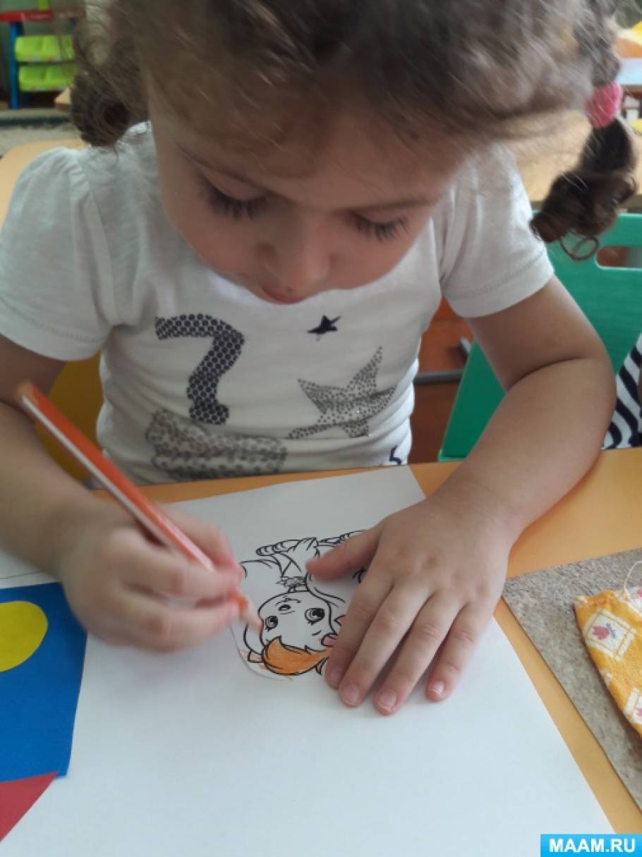 Дети выполняют аппликацию, наклеивают части. В процессе работы помогаю детям, если это требуется, напоминаю приемы намазывания деталей клеем, пользования салфеткой, кисточку кладем на подставочку.