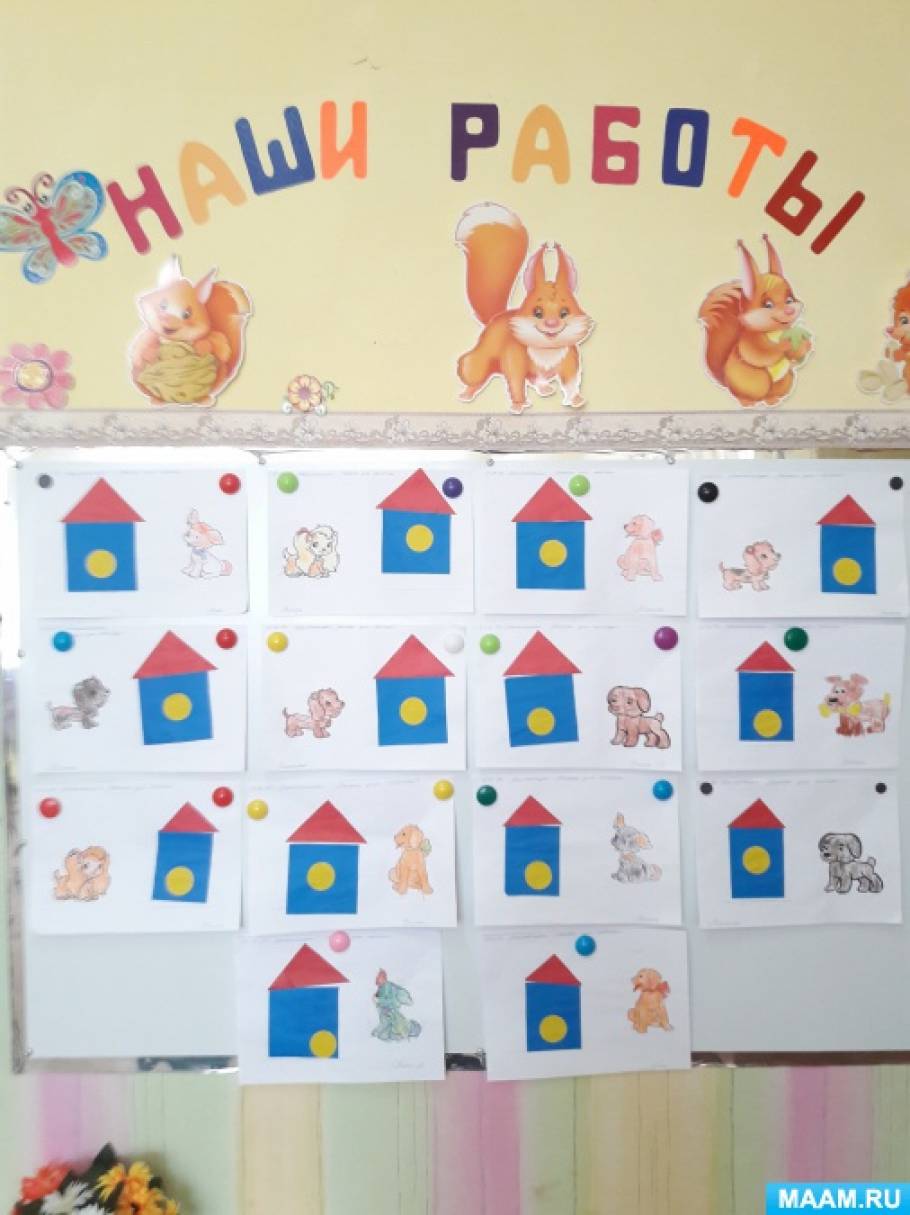 Воспитатель: – Какие красивые, аккуратные домики у вас получились! Посмотрите, сколько их. А у нашего щенка есть много друзей, которым тоже негде жить. Давайте поселим их в ваши домики.