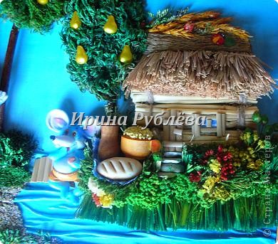 Скарб. На траву наклеим маленькую салфеточку из того же материала, что и шторка. На неё хлеб из солёного теста, кринку "с молоком", горшочек каши (пшено). У меня эта посуда деревянная, позаимствовала у внучки. Можно то же самое вылепить из солёного теста или глины или, даже пластилина. Потом, соответственно, раскрасить. Посуду можно заменить небольшими мешочками с разной крупой.