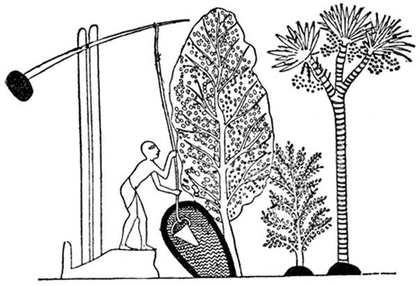 Решение проблемы воды зависит от того, насколько высоко приходится ее поднимать, а на такой реке, как Нил, условия меняются из года в год в зависимости от величины разлива. Древние египтяне изобрели два приспособления для подъема воды. Во время половодья, когда река выходит из берегов, ничего не нужно делать — река сама выполняет всю работу, увлажняя почву и нанося толстые слои ила, заново обогащающего бедную почву. Но как только уровень падает, воду надо поднимать, и тут самое простое приспособление — ведро на веревке — непригодно, им можно достать лишь немного воды для питья. Главным изобретением был шадуф, действующий по принципу рычага: на одном конце тяжелый ком затвердевшей глины, служащий противовесом для другого конца, где находится большая емкость для воды. В условиях пустыни крайне важно беречь энергию, с помощью шадуфа человек может, применяя минимальные усилия, непрерывно поднимать воду — полное воды ведро при подъеме опрокидывается в канал или водосборный резервуар.