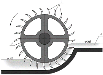 1 – колесо; 2 – черпак; 3 – лопасти; 4 – водоотводящий лоток
