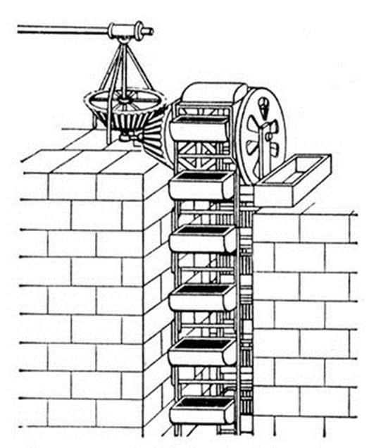 На последнем рисунке приведена схема водоподъемного колеса и система водоснабжения (I век до н. э.): колесо диаметром около трех метров погружено в водоем. По перекладинам, установленным по ободу колеса, шел человек, как бы взбираясь по лестнице. Но получалось так, что он находился на месте, а колесо вращалось с помощью его ног. К ободу колеса были прикреплены ковши. При погружении ковша в водоем он наполнялся водой, а когда он поднимался наверх, вода выливалась в резервуар и далее текла по трубам к бассейну и фонтану.