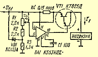 "Схема простого мощного источника тока для зарядного устройства показана на рис. 14. Здесь R4 – токо-измерительный проволочный резистор. Номинальное значение тока нагрузки Iн= dU/R4 = 5 А устанавливается примерно при среднем положении движка резистора R1. При зарядке автомобильной аккумуляторной батареи напряжение Uвх>18 В без учета пульсаций выпрямленного переменного напряжения. В таком устройстве следует применять ОУ с диапазоном входного напряжения вплоть до напряжения положительного питания. Такими возможностями обладают ОУ К553УД2, К153УД2, К153УД6, а также КР140УД18".