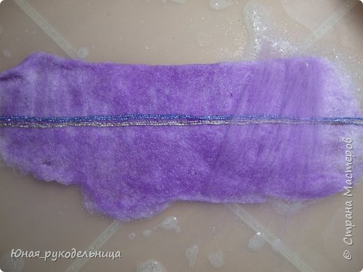3. А теперь можно приступать к самому интересному! Возьмите мыльный раствор (вода должна быть теплой) и начинайте потихоньку поливать этот шерстяной «коврик». Делать это нужно очень осторожно, чтоб слои не расплылись. Лучше всего не лить воду прямо на шерсть, а поливать себе на руку. Следите, чтобы не было слишком много воды.