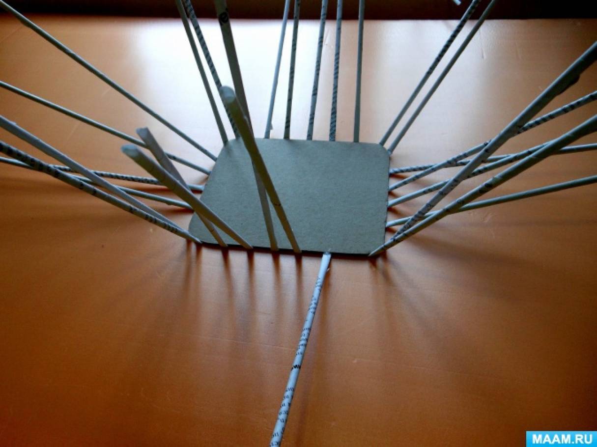 Оставшиеся трубочки — основы обрезаем, но не до конца, а оставляя немного места, чтобы их тоже, смазав клеем, вставить в плетение, как это показано на фото, пошагово.
