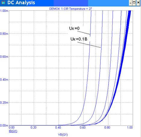 Рис.4.4. demo4_1. Схема для получения входных ВАХ. Аргумент ВАХ – напряжение UБ изменяется в пределах от 0 до 1В с шагом 1мВ, параметр семейства UК изменяется в пределах от 0 до 15В с шагом 0.1В.