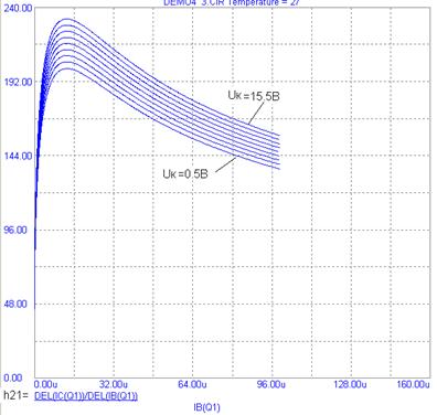Анализ показывает, что значение h21 зависит от режима транзистора. На рис.4.9 на примере demo4_3 показана зависимость h21(IБ, UК) при значениях UК= 0.5, 2.5…15.5. Здесь видно, что на начальном участке при малых токах базы параметр h21 быстро растет, достигает максимума, а потом плавно уменьшается.
