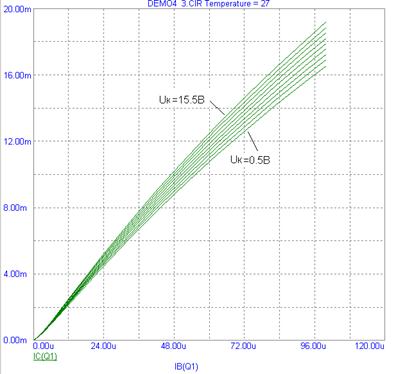 Другой важной ВАХ транзистора является статическая переходная характеристика транзистора IК(IБ) при фиксированном напряжении Uк. На рис.4.10 из demo4_3 приведено семейство переходных характеристик при UКЭ= 0.5, 2.5…15.5.