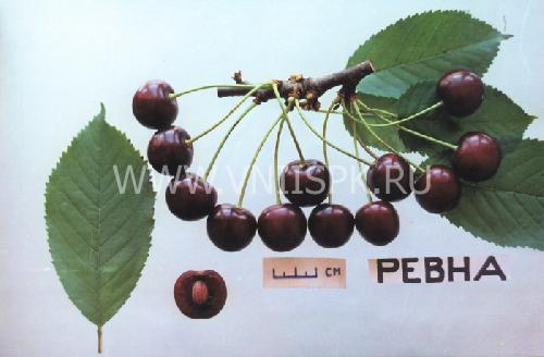 Если к 4–5 годам у дерева правильно проведена формирующая обрезка, оно зацветает и впервые образует завязь. Согласно описанию и фото, сорт черешни Ревна относится к среднепоздним. Плоды массой от 4,5 до 8 грамм держатся на ветках с помощью крепких недлинных плодоножек. Среди сходных сортов черешни брянской разновидности выделяются широкой округлой формой, заметной воронкой, скругленной вершиной и темной, почти черной кожицей. На разрезе черешня являет плотную, наполненную густым соком мякоть насыщенного красного цвета.