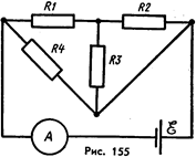 изображенную на рисунке 155, если R1 = 1,25 Ом, R2 = 1 Ом, R3 = 3 Ом, R4 = 7 Ом и ЭДС источника 2,8 В? Сопротивлением амперметра и источника пренебречь.
