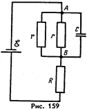 995. Два одинаковых резистора сопротивлением r = 25 Ом каждый и резистор сопротивлением R = 50 Ом подключены к источнику по схеме, изображенной на рисунке 159. К участку АВ подключен конденсатор электроемкостью 5 мкФ. Определите ЭДС источника, если заряд на конденсаторе 110 мкКл. Внутренним сопротивлением источника и подводящих проводов пренебречь.