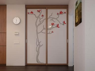 Раздвижные двухстворчатые двери из шпона с пескоструйным стеклом эффектно смотрятся.