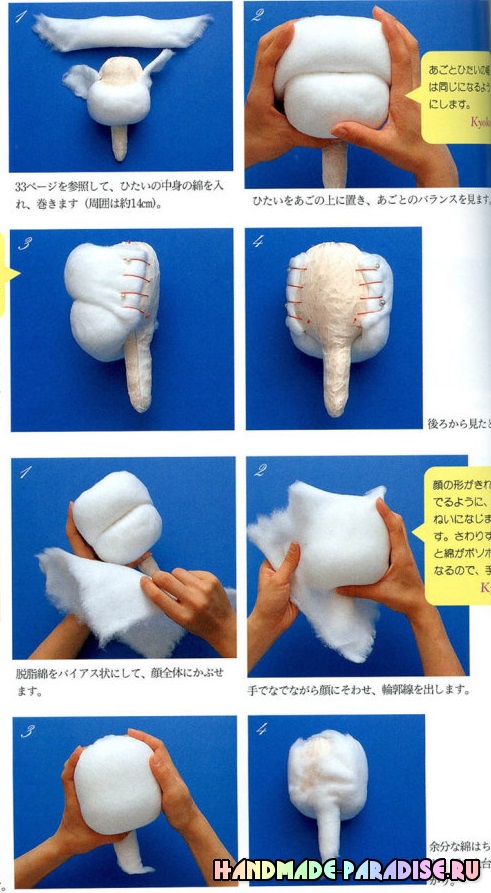 Синтепухом мы приваливаем лоб и затылок, следя за тем, чтобы глаза были по центру личика.