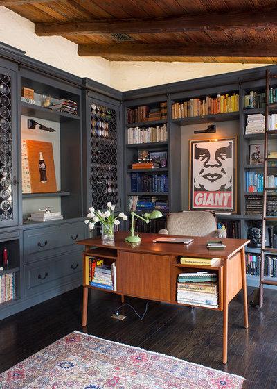 Еще один логичный способ использовать напольные розетки — когда огромная гостиная также служит библиотекой и кабинетом: стол стоит в окружении книжных полок. Несложно представить, как именно выглядела бы эта комната в случае самостоятельного ремонта — удлинитель тянулся бы к одной из стен и в лучшем случае его прикрыли бы ковром, чтобы не спотыкаться.