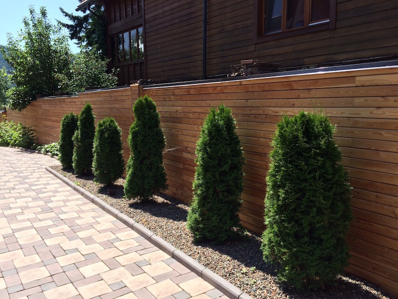 Очень красиво выглядят приватные живые растения, типа туи. Если выращивать их, то это займет много времени, но всегда можно купить уже довольно большие растения.