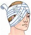 Наложение повязки на рану волосистой части головы осуществляют следующим образом: от бинта оторвать кусок (завязку) размером около 1 м, положить его на область темени, концы опускают вертикально вниз спереди от ушей; сам больной или кто-нибудь из помощников удерживает их в натянутом состоянии. Тур бинта начинают с левой стороны на уровне лба, переходят на правую сторону назад на затылок, таким образом делают два тура с обязательной фиксацией первого тура. Третий тур бинта оборачивают вокруг завязки то слева, то справа, так что бы он на 1/2 или 2/3 перекрывал предыдущий тур бинта. Каждый последующий тур ведут все выше и выше, пока вся волосистая часть головы не будет забинтована. Последний тур бинта привязывают к оставшейся вертикальной части завязки с любой стороны. Вертикальные концы завязки закрепляют под подбородком.