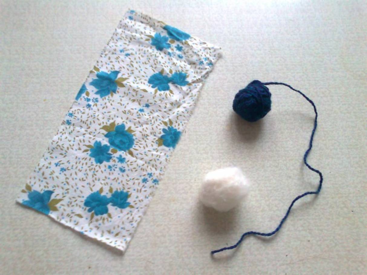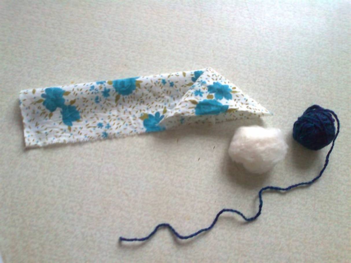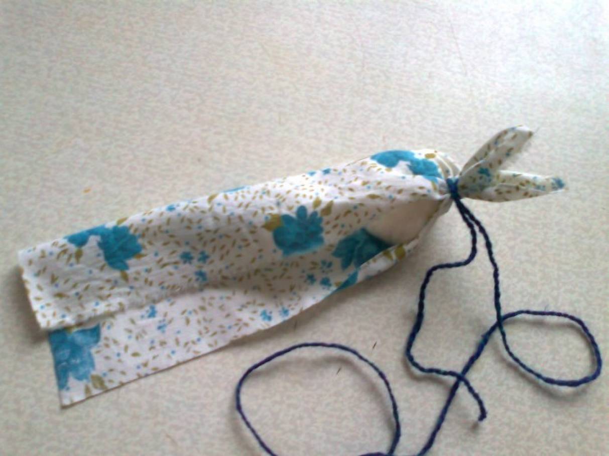 Приготовьте прямоугольный кусочек ткани размером 20*10. Ткань для зайчика в старину принято было не резать ножницами, а отрывать. Современному же человеку без ножниц трудно обойтись, поэтому выбирайте сами. Также понадобится толстая нитка длиной 50 см. и комочек ваты или сентипона.