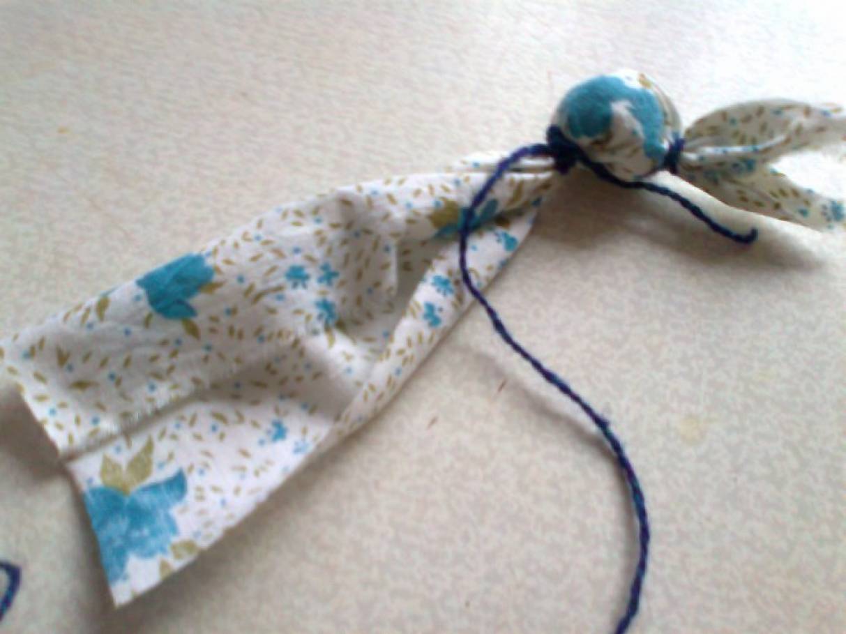 Примерно посередине наклонной линии собираю ткань в пучок и туго перевязываю концом нити. Другой конец нити мне пригодится в дальнейшем. У меня получились заячьи уши. Я их расправляю, кто связал правильно чётко увидит маленький носик.