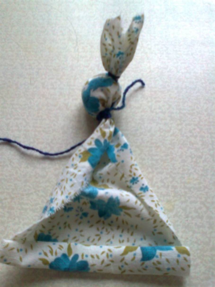 Приступаем к поделке. Прежде всего, посредине белого лоскута размещаем шарик наполнителя и завязываем ниткой, делая голову куклы. Чтобы сделать руки, на белой ткани по диагонали загибаем уголки вовнутрь, потом ещё раз сгибаем как на самолётик и обматываем ниткой. Получились ладошки куклы. Следующий этап – кладём больший шарик наполнителя и формируем грудь. Перетягиваем ниткой красного цвета. Лоскут в форме круга складываем вчетверо и обрезаем уголок. В отверстие протаскиваем куколку юбкой вперёд, задираем цветную юбку и с изнанки приматываем ниткой. Переворачиваем и расправляем верхнюю юбочку. На головку завязываем ленточку-повойник. И надеваем платок.