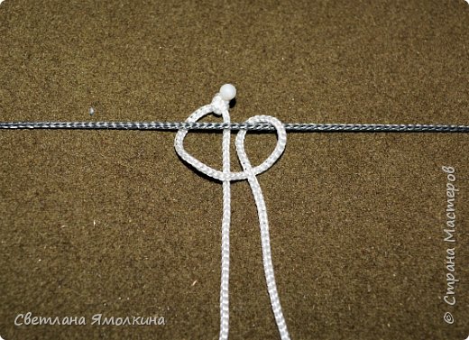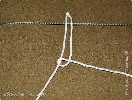 Закрепляю основную нить на подушке (серая), она потом тоже примет участие в плетении. Закрепляю другую ( белую нить) в середине и плету на ней два петельных узла.