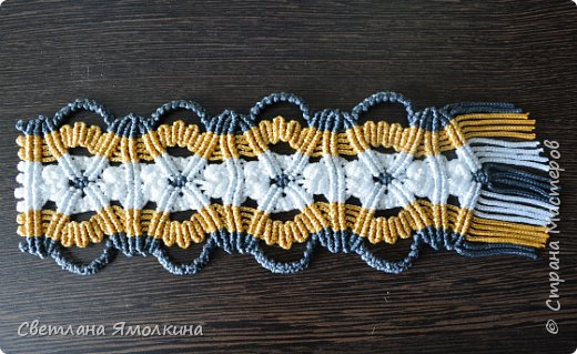 Здравствуйте, дорогие жители СМ! Попросили меня сделать МК макраме для деток. Преподавателю нужны были только фотографии, все пояснения она будет давать сама. Решили сплести широкую закладку для книги. Основным заданием было показать определенный набор узлов и повтор элементов, для закрепления полученных навыков. По задумке педагога, детки должны были плести из шпагата, а начали плести из хлопковой нити. Со шпагатом я последнее время не дружу, поэтому плела из остатков пряжи Macrame YarnArt (серая, золотая, белая), она больше похожа на шнур. Размер закладки получился примерно 7х20 см.